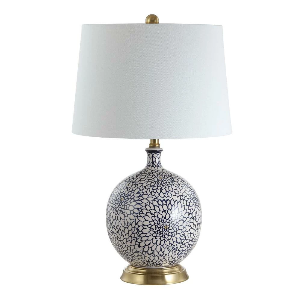 This contemporary table lamp features a rounded body decorated with a delicate floral outline design in blue. A gold base and finial add to its modern charm.