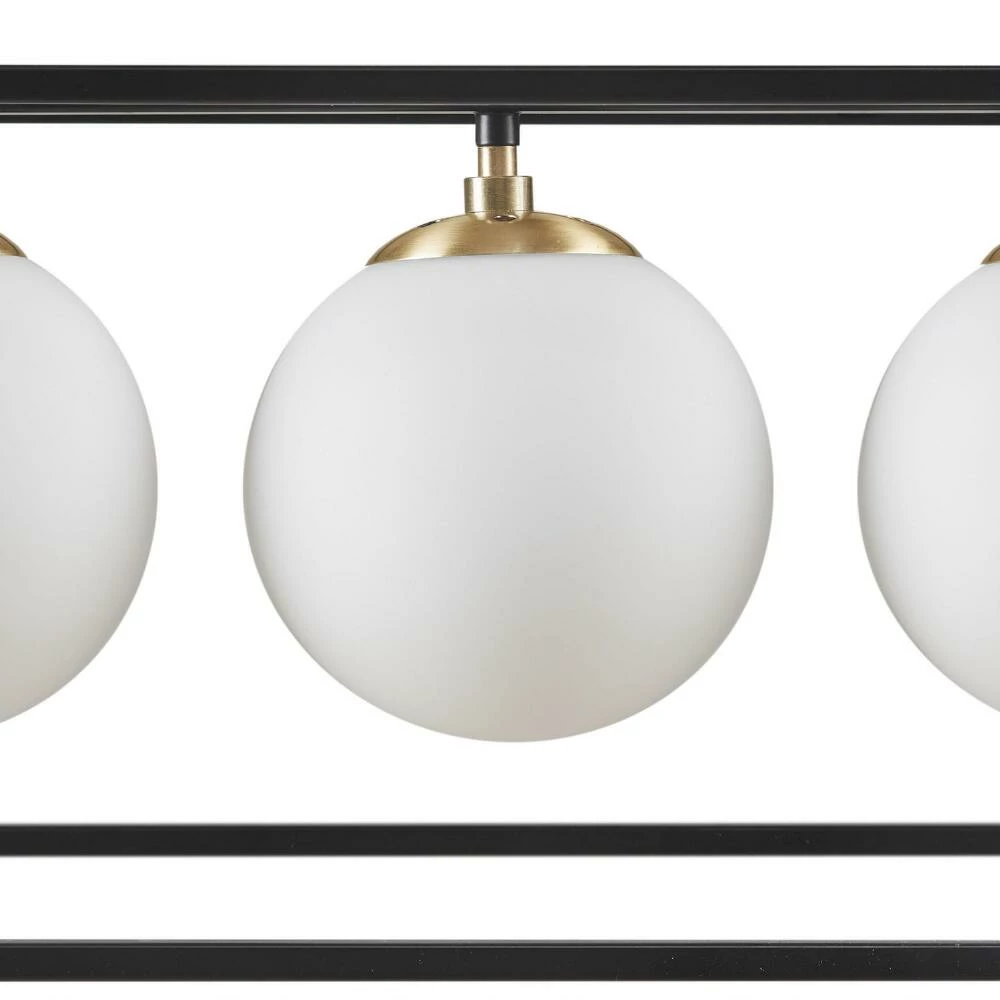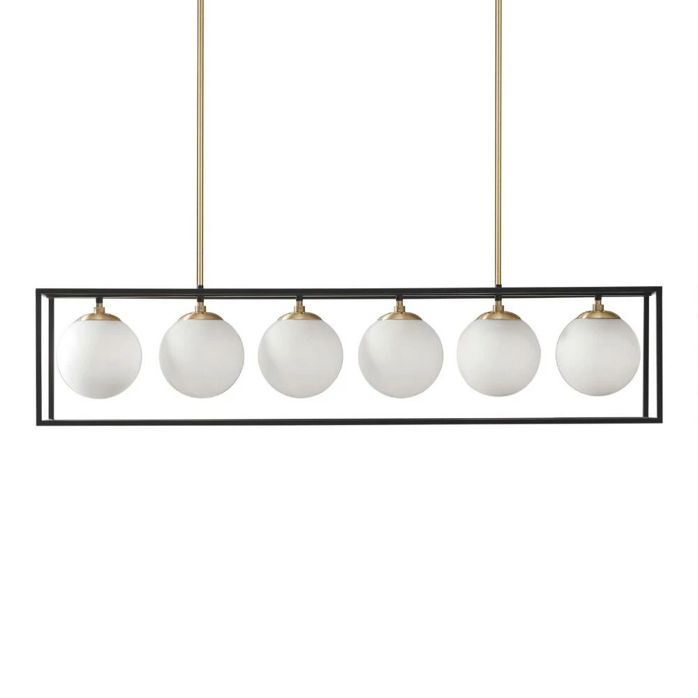 Designed with contemporary clean lines, this statement-making pendant lamp hangs from antique brass hardware with an open black metal frame for added dimension. In retro-meets-industrial fashion, this unique fixture has six frosted glass orb lights to lend an inviting glow above any dining table, kitchen island or hallway.