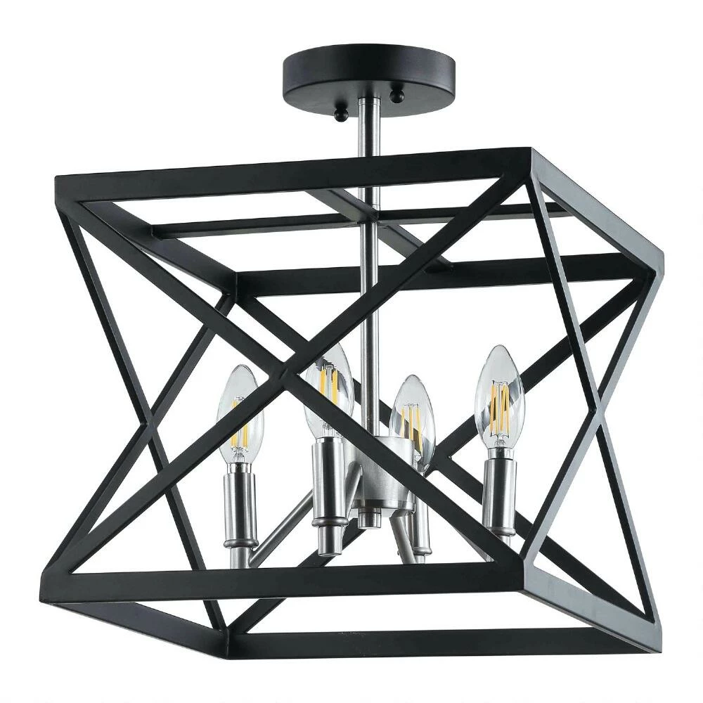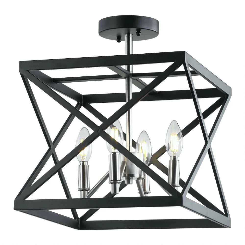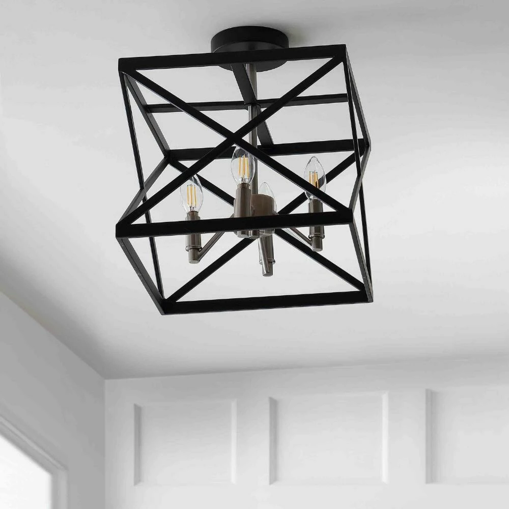 Bold, angular lines give the Matias flush-mount ceiling light its captivating appeal. This overhead light features four exposed candelabra bulbs set in gleaming nickel and encased by an open geometric metal frame in a versatile black finish. A chic way to light up a room, this ceiling lamp from Safavieh is equally contemporary and industrial in style.