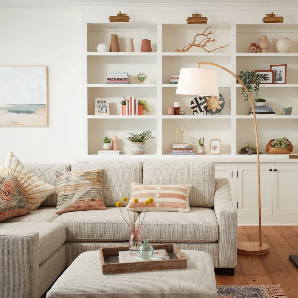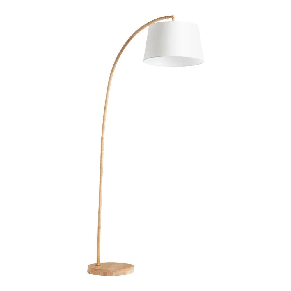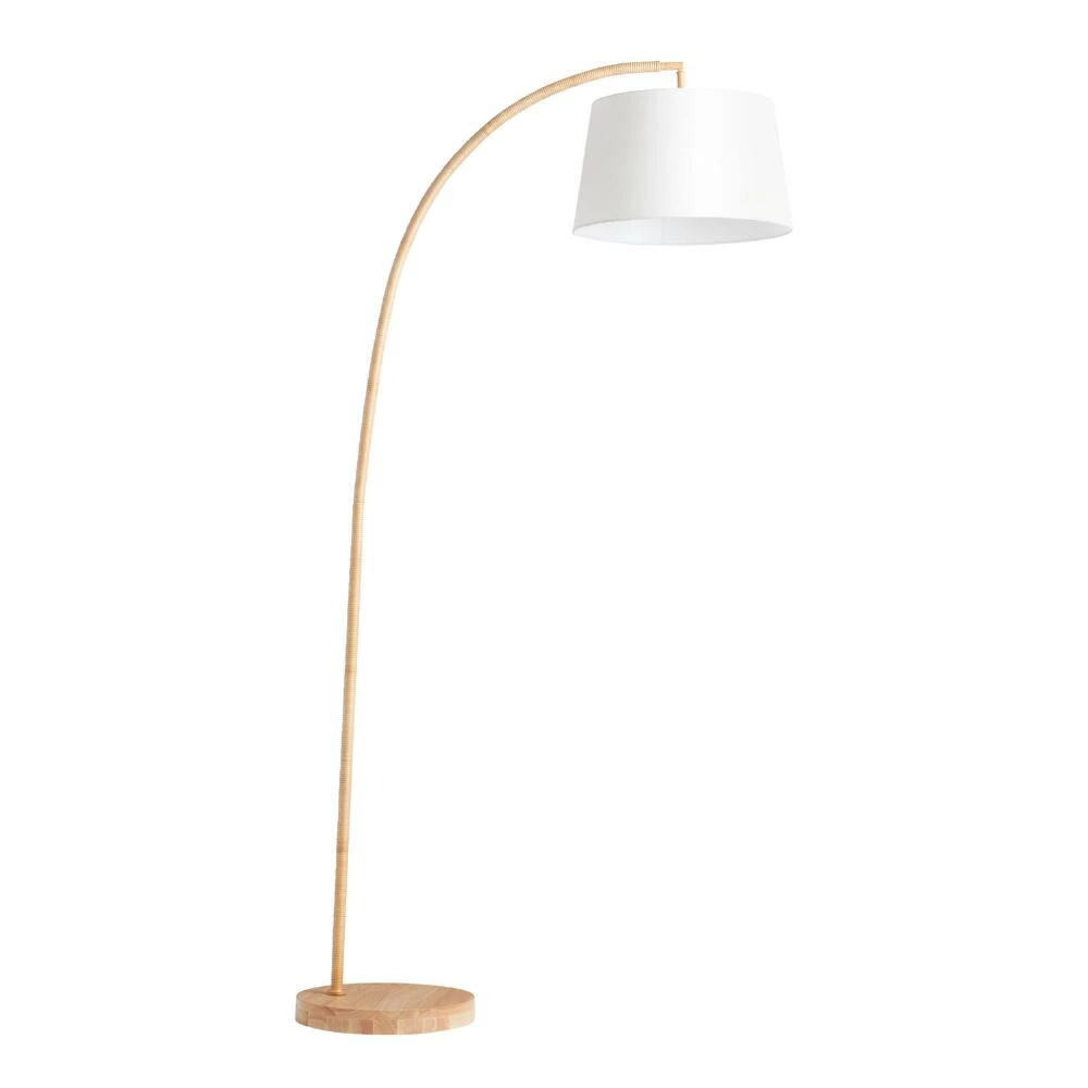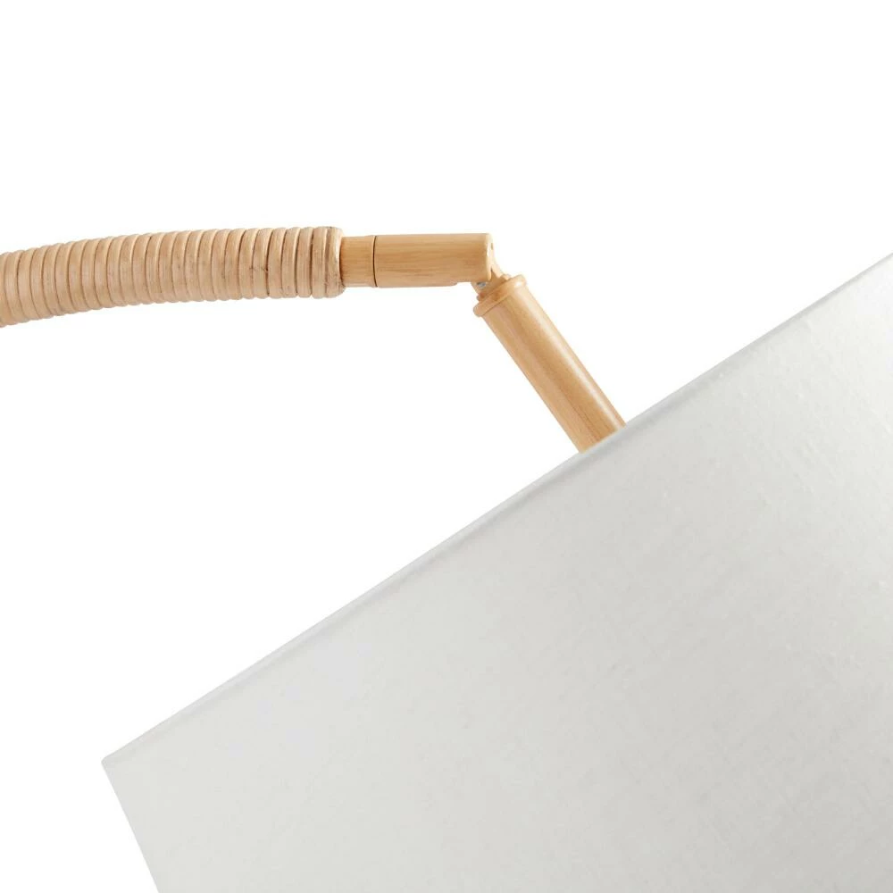 The Maya floor lamp draws attention with its on-trend arced silhouette. Handcrafted by artisans in the Philippines, this sleek light source features a graceful natural rattan arch set on a beautifully grained rubberwood base. Finished with a white fabric shade, this arc lamp is a distinctly modern lighting solution with an air of boho charm.
