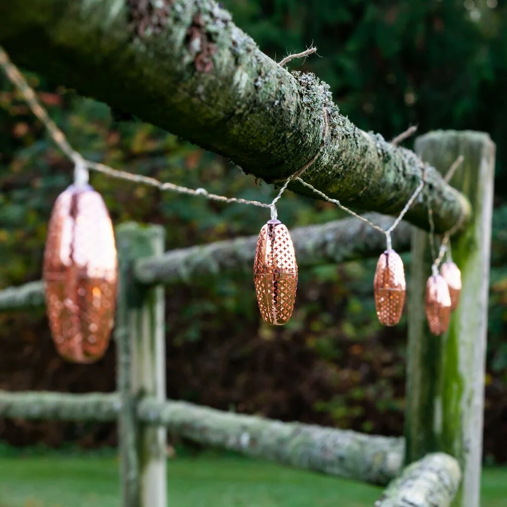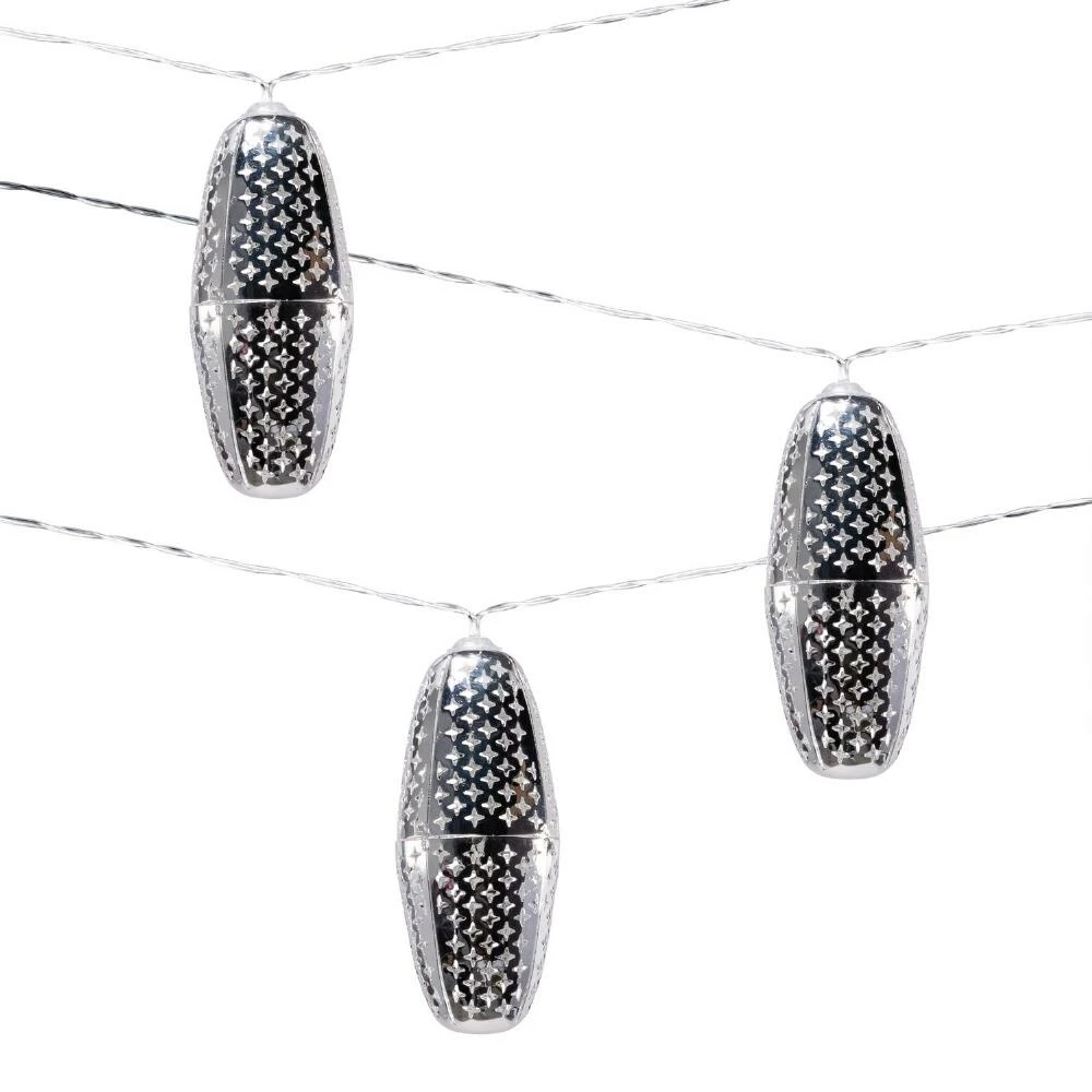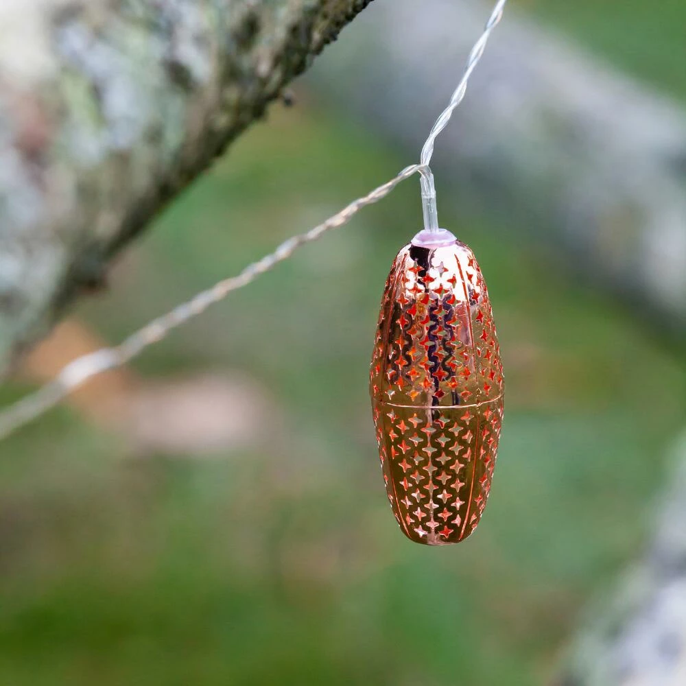 Create a tranquil atmosphere on your deck or patio with these metal string lights, made with a punched star pattern inspired by the vibrant markets of Morocco. Weather-resistant, solar powered and available in your choice of shining silver or copper finishes, these intricate outdoor string lights are unique patio decor for any backyard dining or lounging area.
