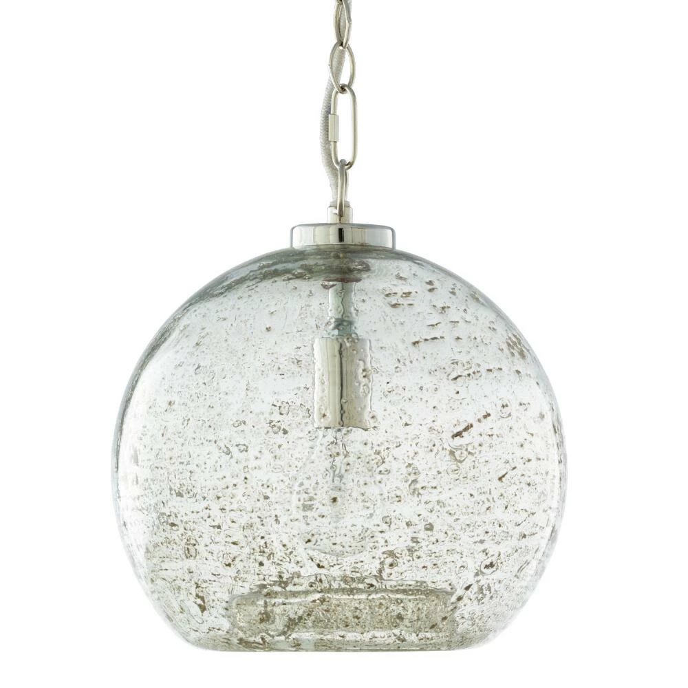 Shining bright light through a semi-transparent globe fashioned of seeded glass, the Mist pendant from Surya is the perfect space-saving hanging lamp for a kitchen, dining room or hallway. Suspending from the ceiling with a burnished nickel chain, the bubbled glass glows with eye-catching texture as it directs light through an open base. Available in a neutral gray or nautical blue, its modern look enhances any setting in pairs and multiples.