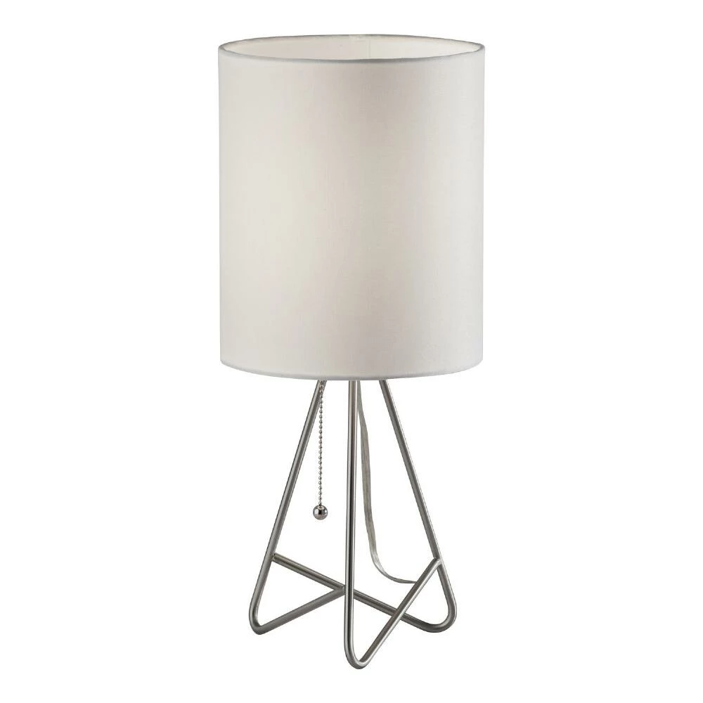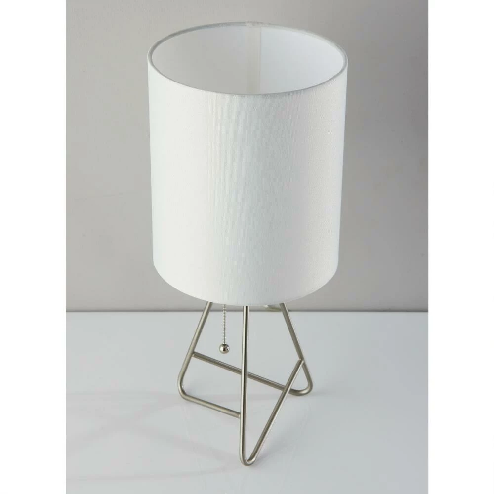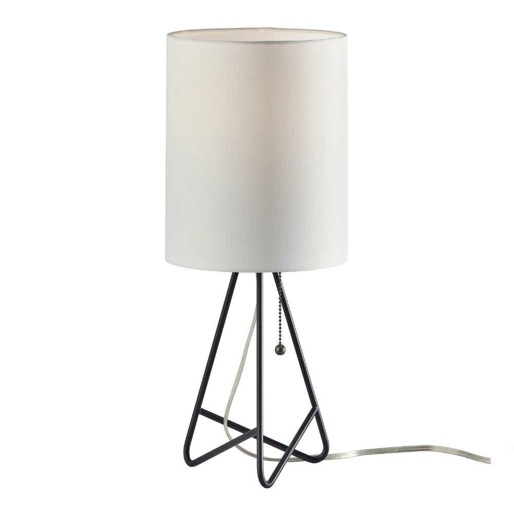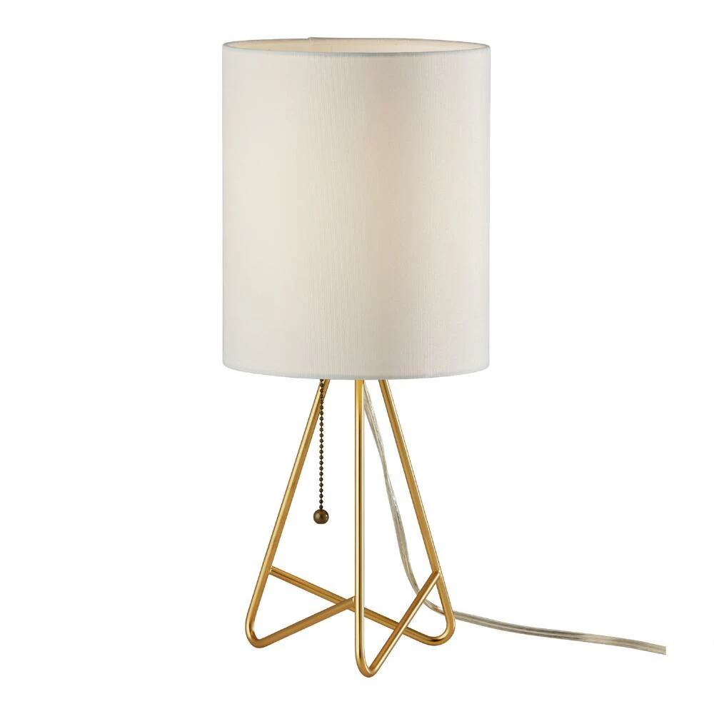 A perfect harmony of vintage and modern design styles, the Nell table lamp by Adesso adds an inviting glow to any table or desk in your home. The tall white fabric shade is made from recycled plastic bottles and is set on an angular, abstract tripod base with rounded corners. Available in antique brass, brushed steel and black finishes, this petite piece packs a stylish punch.