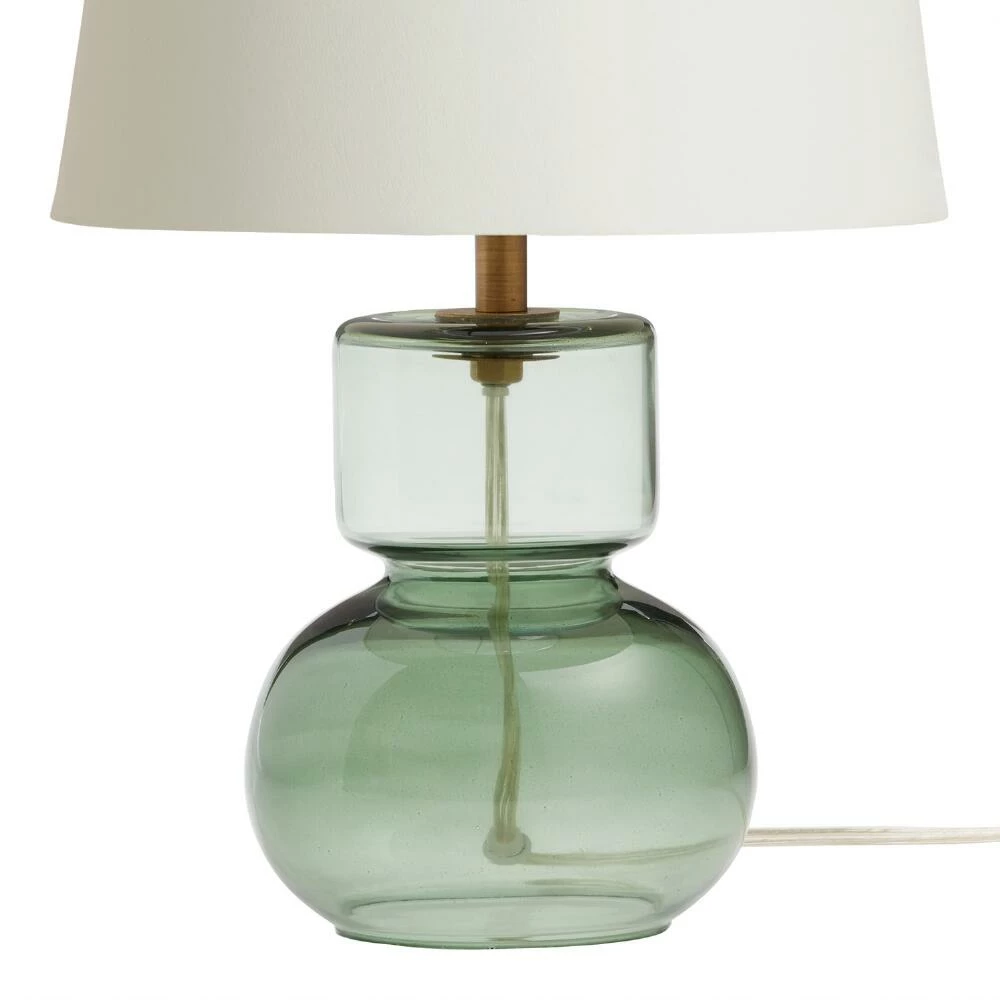 Crafted of mouth-blown glass with a soft green tint that shines in the light, this unique accent lamp base presents geometric sophistication with its rounded two-tier structure. A softly colorful object lamp that brings new dimension to your decor, this petite desk lamp can be customized with any of our mix-and-match accent lamp shades.