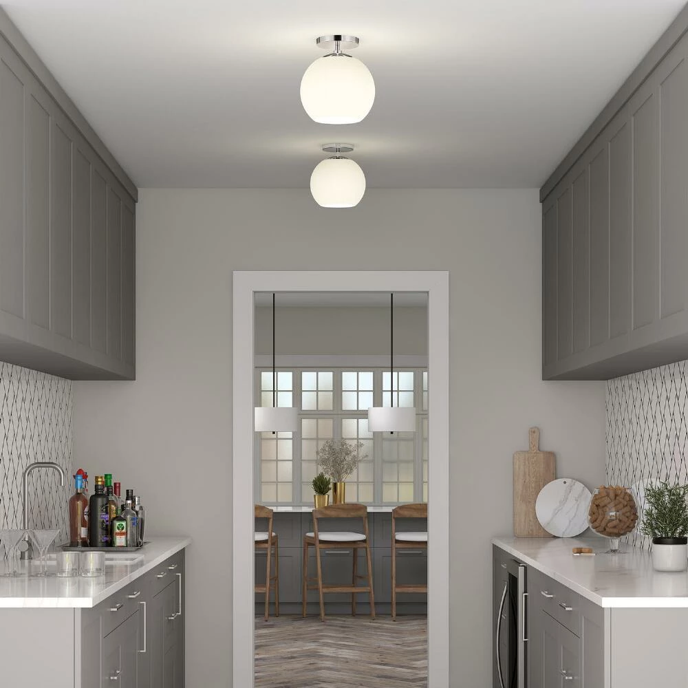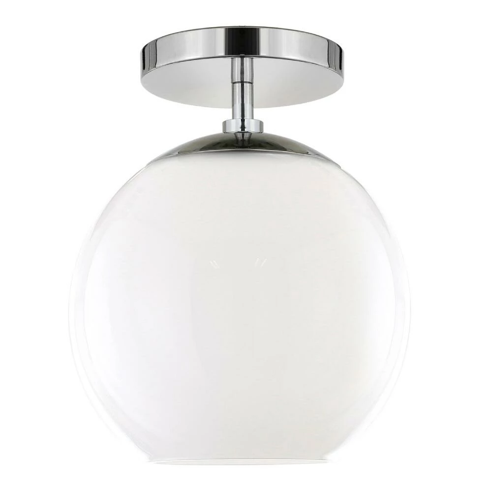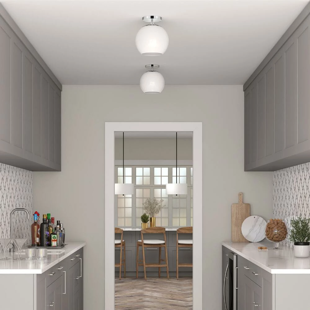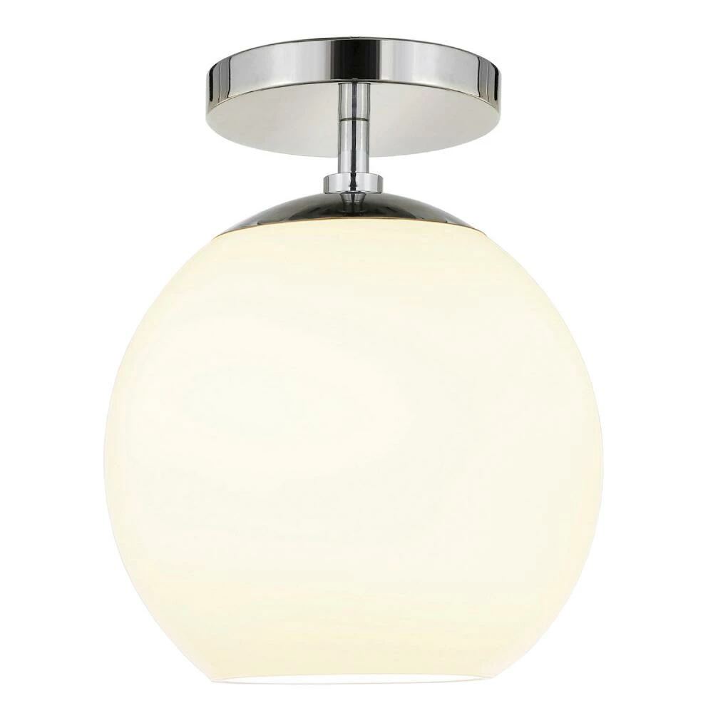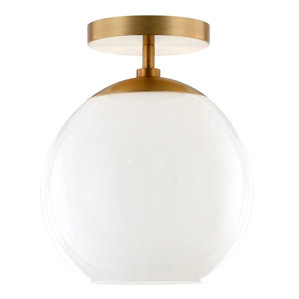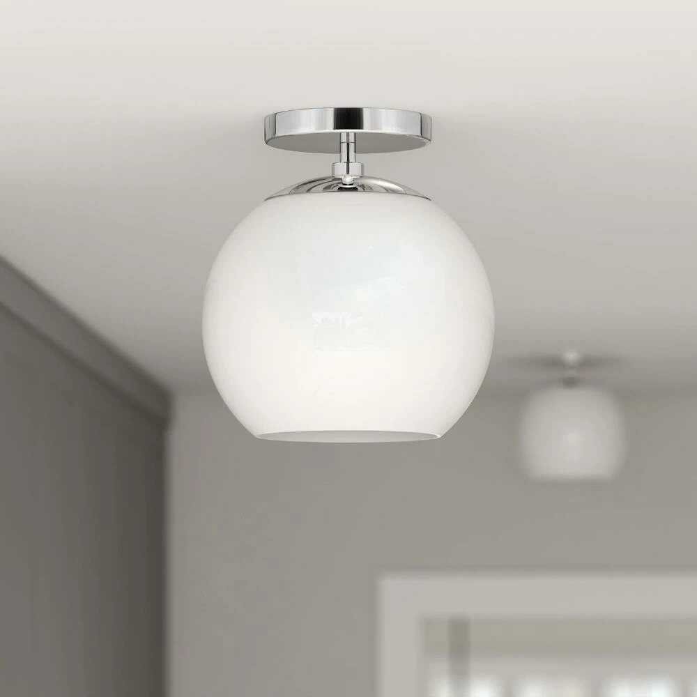 Featuring a round drop shade crafted of white glass, the Patti ceiling light installs semi-flush with a modern metal ceiling cap in classic matte black, warm golden brass or gleaming nickel. A space-saving lighting solution for hallways, entries and bedrooms, its retro vibe complements a range of decor in your preferred style. When illuminated its globe shade glows like vintage-style milk glass as warm light shines through the semi-open base.