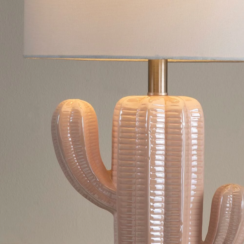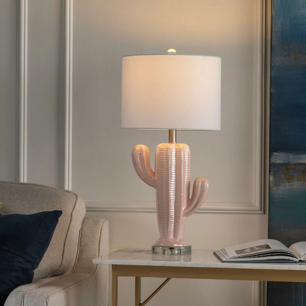 Pretty in pearlescent pink, this unique table lamp is crafted of ceramic in the finely textured shape of a saguaro cactus with proud upraised arms. Accented with a gleaming silver base and neck, it features three light settings that set the white-linen drum shade aglow to your preferred level of illumination. A whimsical statement piece for the office, bedroom or living room, its iconic styling makes it an eclectic standout in any room.