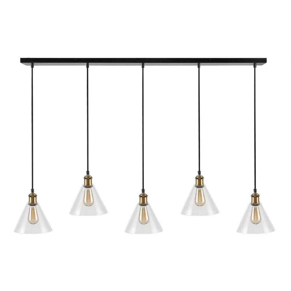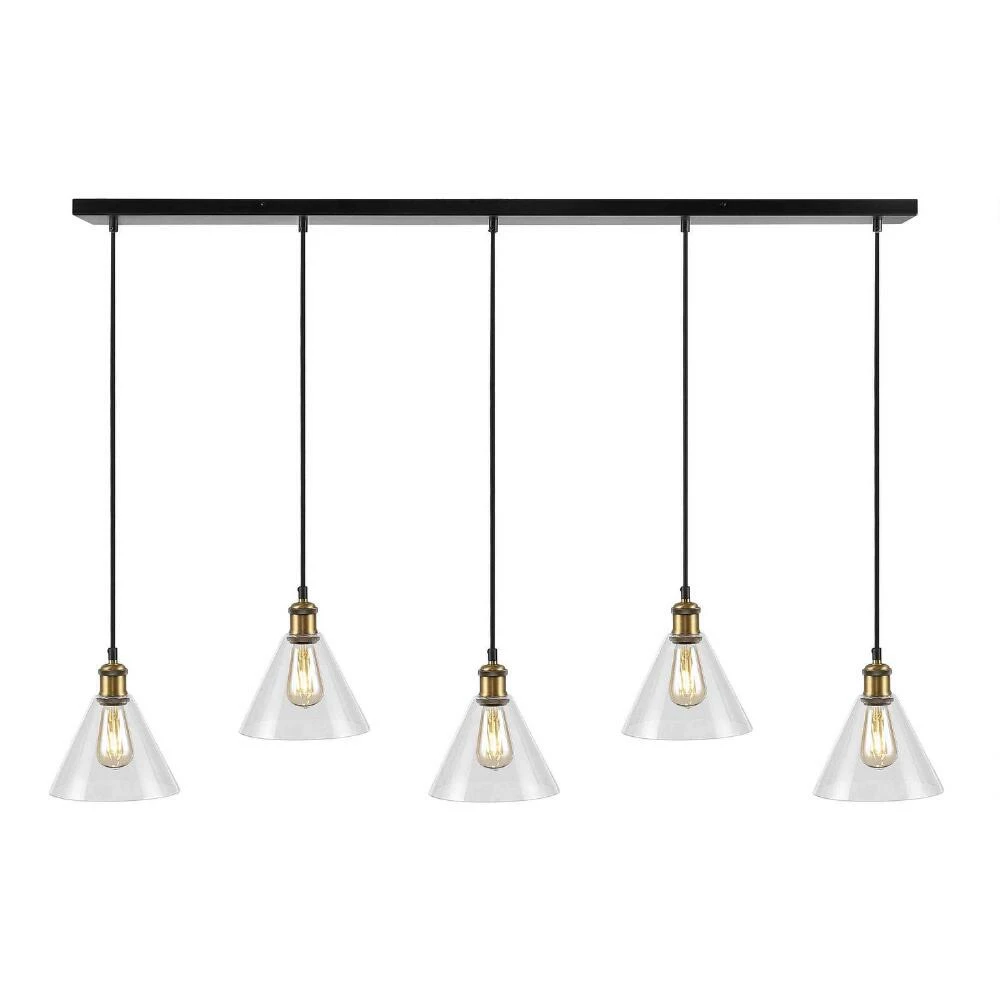 The clean-lined Presta pendant lamp from Safavieh features five lights that hang at various lengths for added dimension. In a sleek, minimalist design with an industrial edge, this hanging light combines black and gold metal hardware with clear glass. This modern overhead light casts a warm glow that enlivens a room.