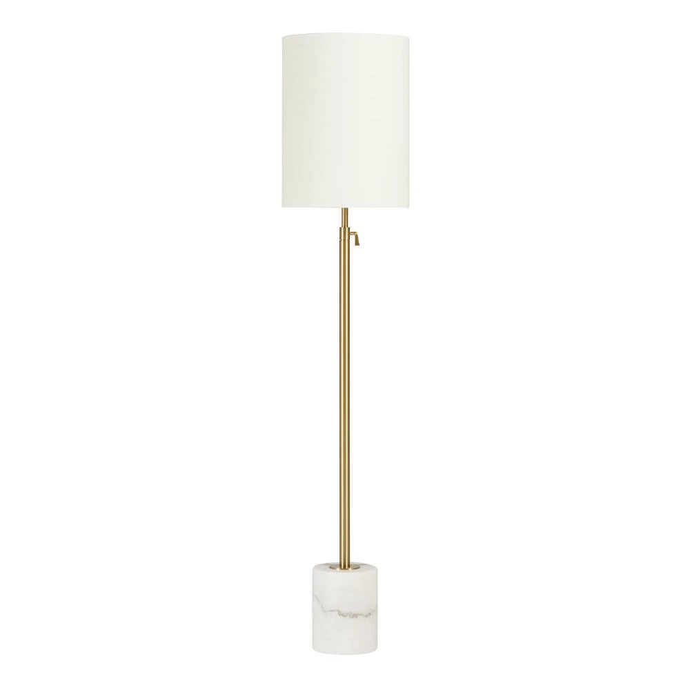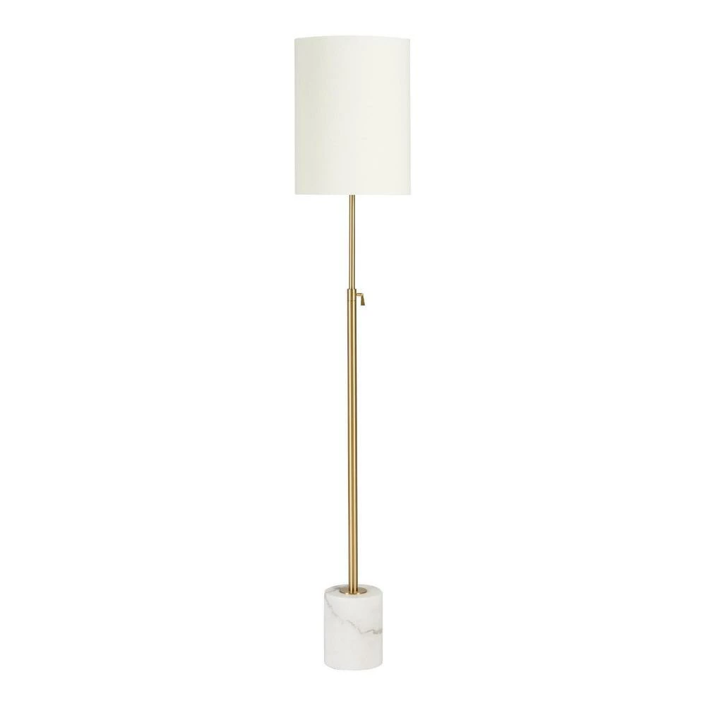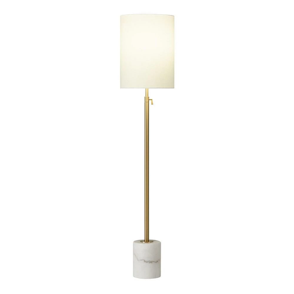 Featuring a brass-finished telescoping pole anchored by a refined marble base, our exclusive floor lamp includes a tall white lamp shade for a complete look. The slim profile of this sophisticated lamp makes it easy to place in tight spaces near chairs or desks, and its height adjusts up to a foot higher to shine light where it’s needed.