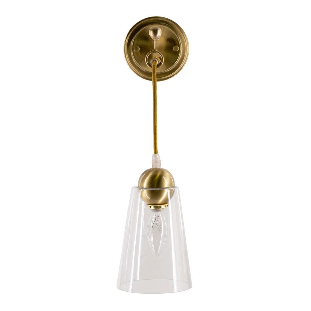 Hand-finished by experts in brushed gold, the modern Seaham wall sconce suspends a round fixture fitted with a conical glass dome shade from a textile cord anchored by an extending arm. Both an inspired decorative accent and a small-space lighting solution, it ornaments a wall with its eye-catching design while illuminating furniture and decor. Its clear shade makes it perfect for pairing with a retro Edison-style bulb.