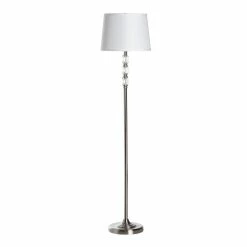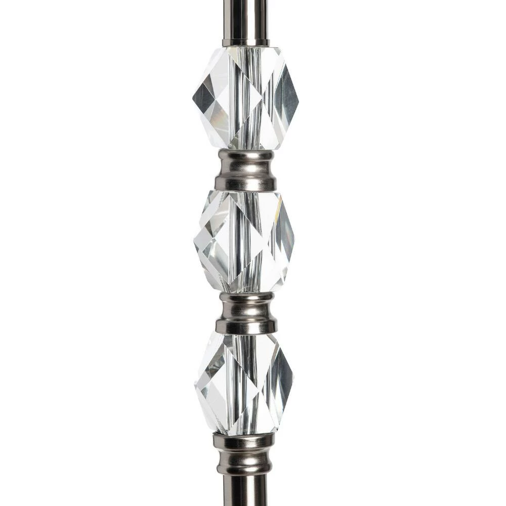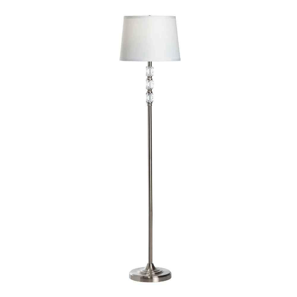 The glamorous Seneca floor lamp showcases three faceted crystal-glass accents embedded like jewels in a sleek turned base of shining brushed nickel. A large linen drum shade in crisp white is the perfect finishing touch to this elegant tall lamp. A convenient 3-way switch makes it easy to fine-tune its brightness in the den or living room.