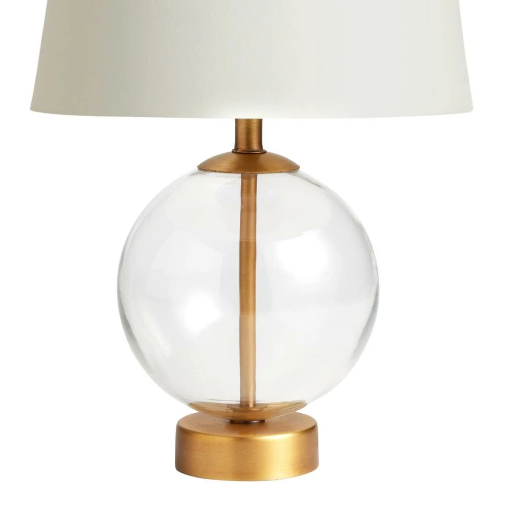 Our exclusive Serena accent lamp features an antique brass base with a matching pedestal extending through a clear glass globe. Its clean, sculptural appeal is easy to customize with any of our accent lamp shades.