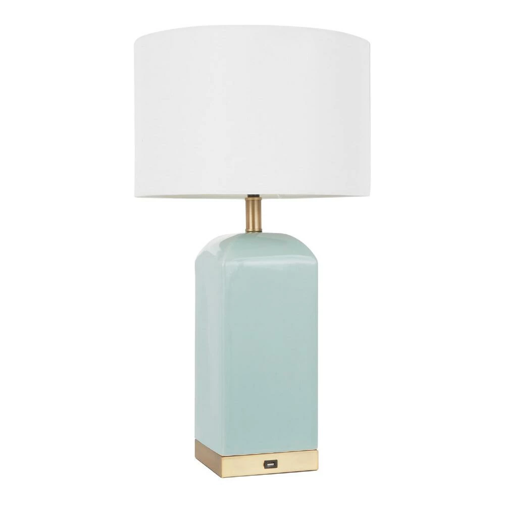 Crafted of glossy aqua ceramic with a chic block silhouette, the Tessa table lamp features a crisp white linen drum shade and an antique-brass base with a USB port. A two-tone accent with playful appeal in modern and contemporary homes, its round drum shade is the perfect finishing touch.