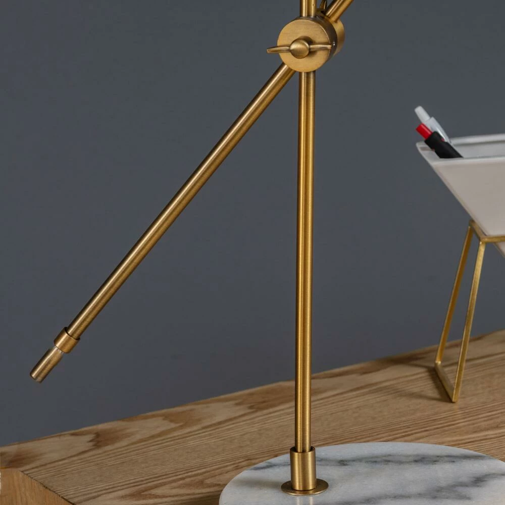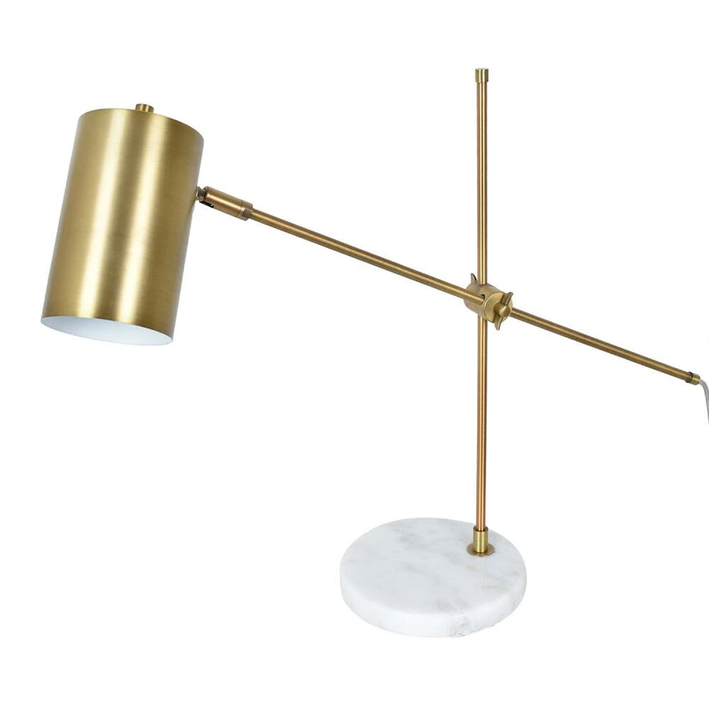 Inspired by mid-century industrial design, the two-tone Torrey desk lamp pairs a sleek swing arm and pivoting task shade in gleaming gold with a round base of genuine white marble. Effortlessly stylish and easily adjustable, its compact elegance makes it the perfect petite table lamp for an office, study, reading nook or anywhere you need bright, focused light.