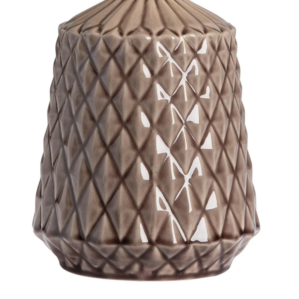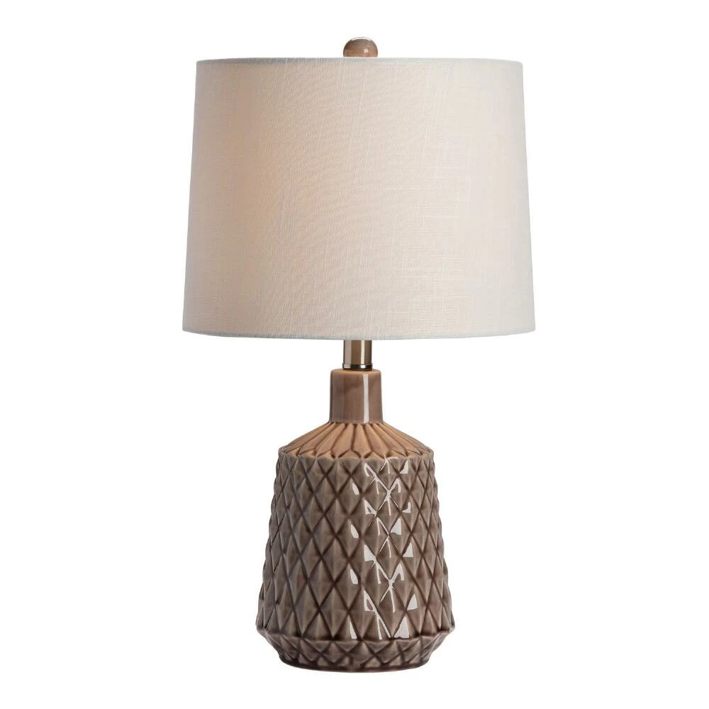 Embossed with a faceted geometric pattern of brown diamonds, this ceramic Tunsten table lamp redefines your decor with modern dimension in a versatile neutral hue. Filtering warm light through a drum shade crafted of textured white linen, it adds a bold new look to the living room or bedroom.