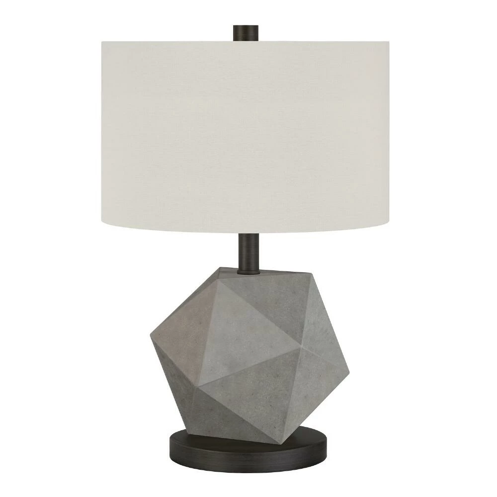 Crafted of faceted natural concrete in gray with black-metal accents, this sculptural Twila table lamp is an ornamental showpiece that shines warm light through a crisp linen drum shade. Adding an abstract modern flair to the living room or bedroom in versatile neutral hues, its geometric base is complemented by the chic round shape of the off-white shade.
