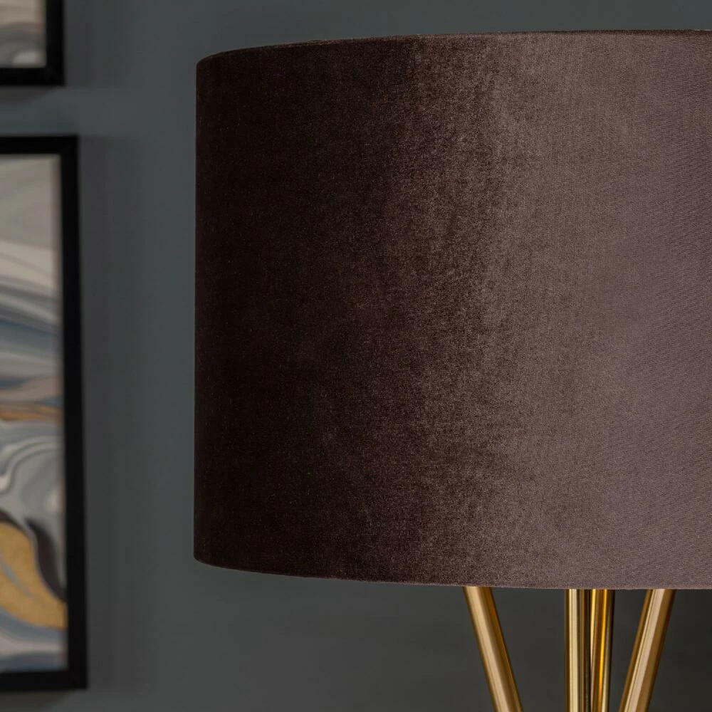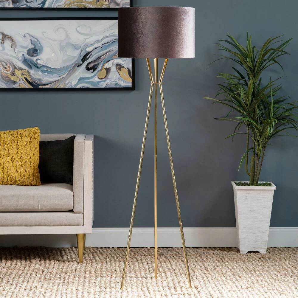 Featuring a minimalist tripod base in sleek metal, the Darien floor lamp is crowned with a large drum shade crafted of luxurious velvet. A space-saving addition to a modern living room, bedroom or study that offers the convenience of three brightness settings, it’s finished in glamorous gold with a taupe shade.