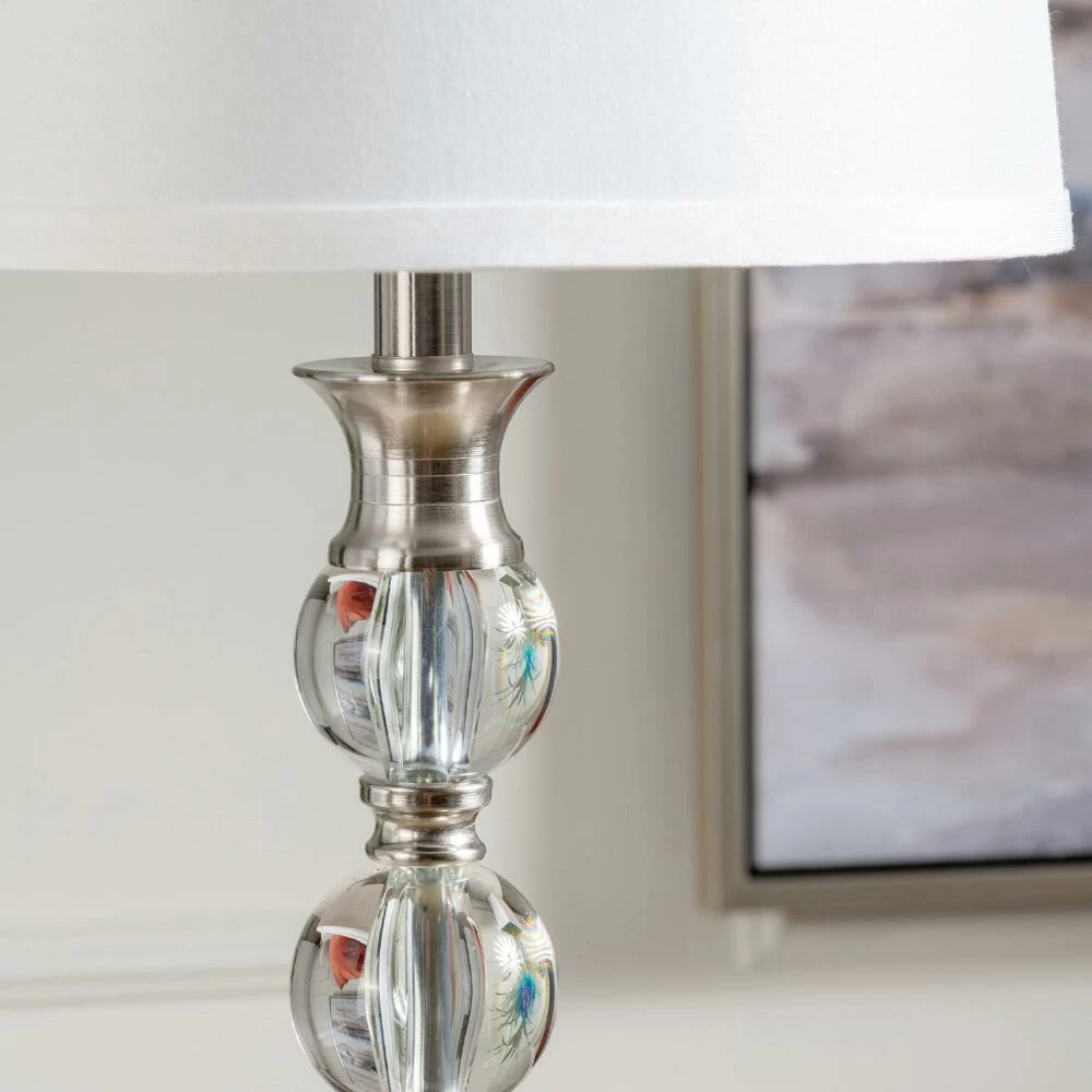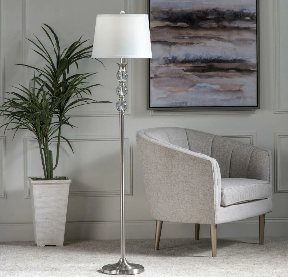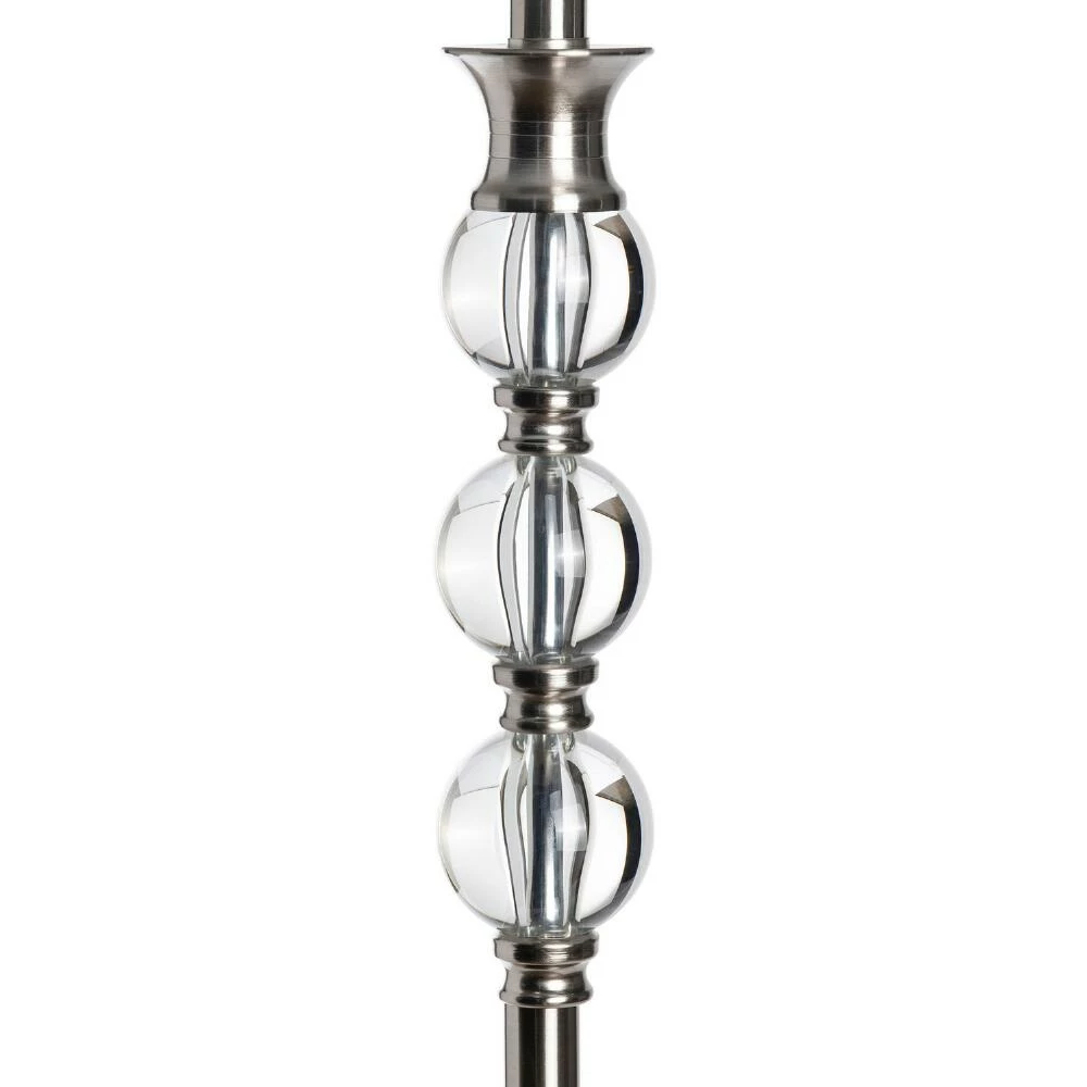A luxe source of illumination, the Vida floor lamp features a sleek silver base and pole with shimmering crystal-clear acrylic accents that beautifully catch light. This contemporary lamp is topped with a tapered white linen shade that diffuses light into an inviting glow.