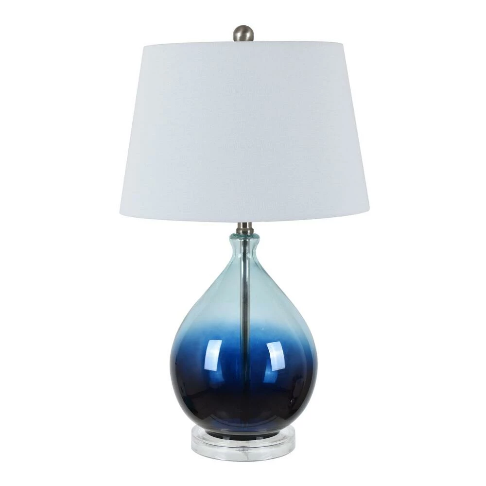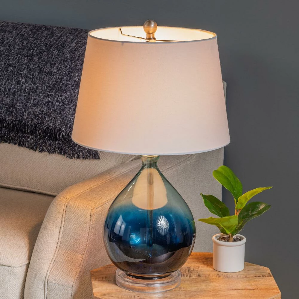 The artistic elegance of the Wilna table lamp is defined by the blue-ombre shading of its glass teardrop silhouette. Accented with a clear crystal-glass base and burnished silver hardware, this ornamental lamp presents a complete look with a classic white linen shade. Placed on a nightstand in the bedroom or side table in the living room, its 3-way switch fills the room with your preferred level of light on demand.