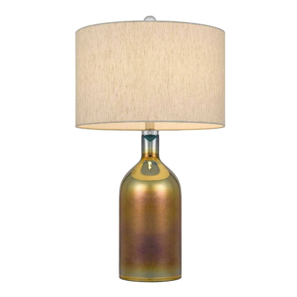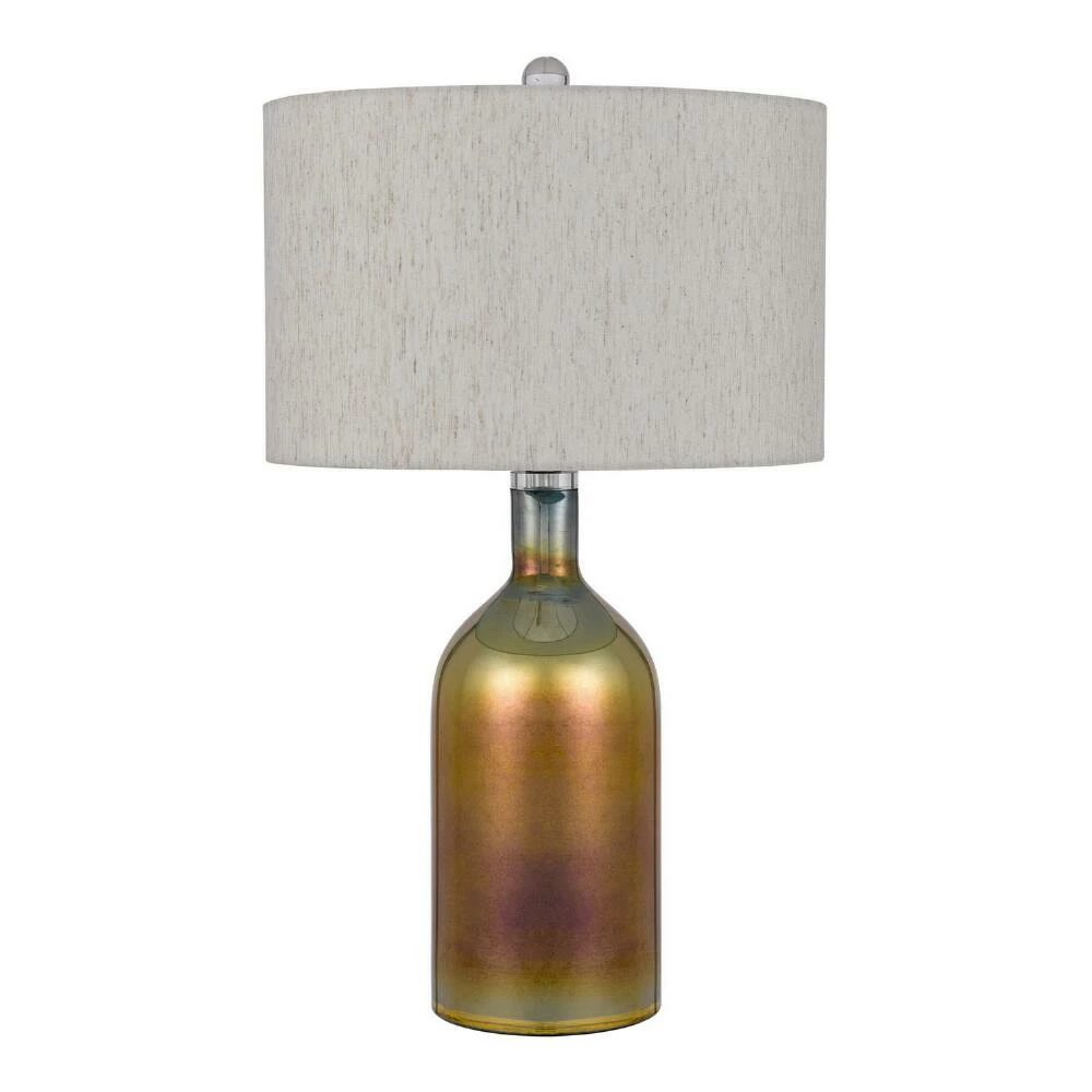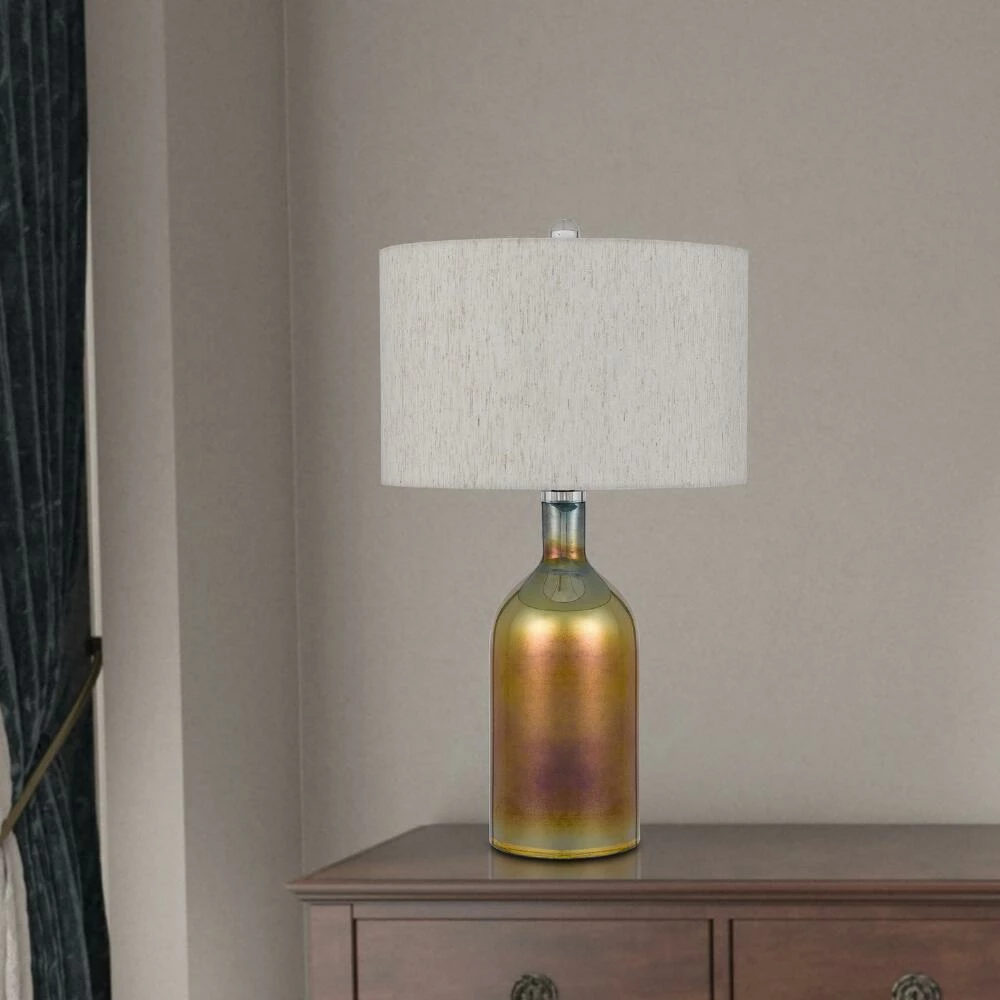 Embellished with an iridescent patina finish for a luxe look, this sleek, tall table lamp with a bottle silhouette is a standout lighting choice. With varying tones of green, gold and brown on the base and clear glass accents topped by a linen drum shade that gracefully diffuses the light, it’s a unique addition to a nightstand, end table or desktop.