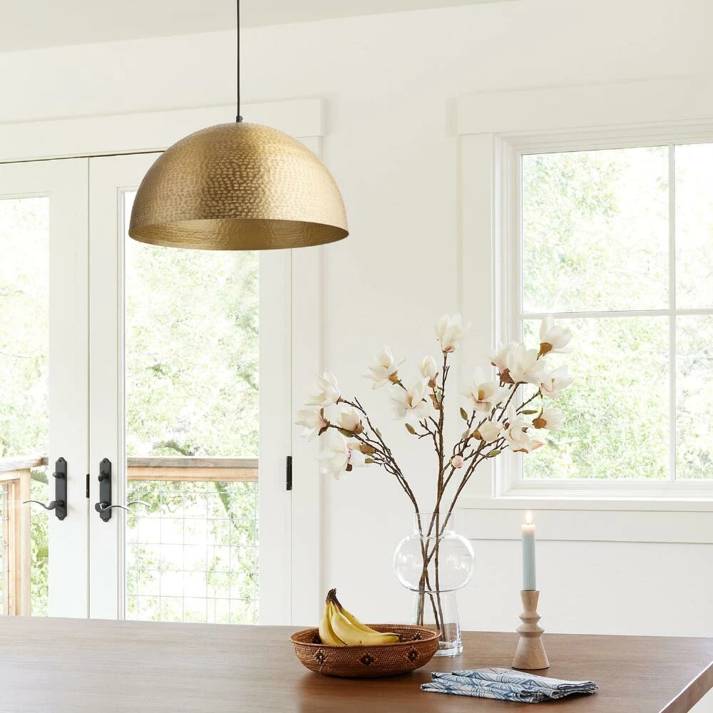 Pull a room together with the dimension and texture of the Zuri pendant lamp, handcrafted of hammered metal. Light reflects off its brass finish to create a warm, mood-enhancing glow. In a chic dome shape, this hanging lamp is a modern, space-saving lighting solution for the dining room, living room or bedroom.